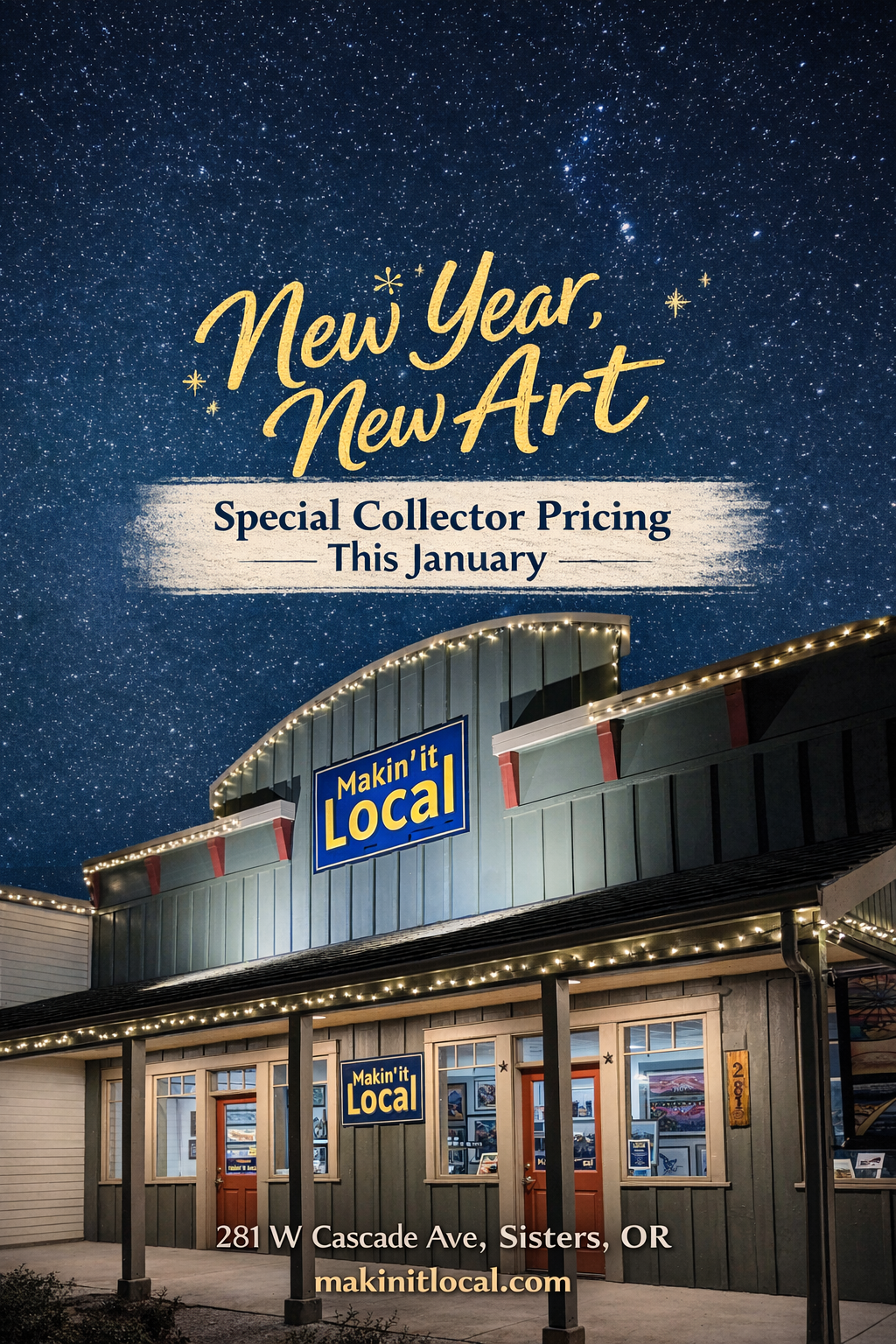 Shop online or visit us in the gallery now through January 31, 2026. Look for our “New Year, New Art” link at www.makinitlocal.com, order online with local pickup, or take advantage of our low flat-rate and free shipping options. If you’re visiting us in downtown Sisters, keep an eye out for green dot pricing on select art—your key to limited-time savings. Selection is limited, and when it’s gone, it’s gone, so early shopping is encouraged.