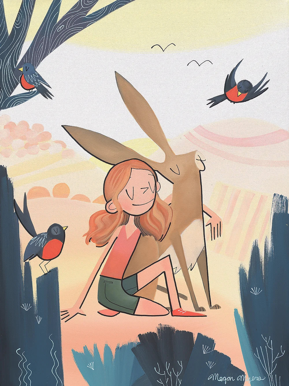 Megans work explores landscapes composed of whimsical mountains, forests, deserts, rock formations, oceans and rivers. The children and animals that typically appear as the subjects radiate with innocence and a sense of wonder brought forth by a connection to nature. The characters journey through the outdoors, exploring themes of companionship, protection, wilderness and the greatest adventure of all, love.